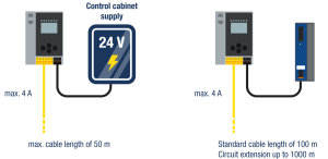 Generally, the resistance of a cable grows with its lengh. Therefore, when using 24 V power supplies, you should never exceed theASi cable length of 50 meters as otherwise the voltage drop across the cable could be too high, thus resulting in insufficient voltage at the end of the line.