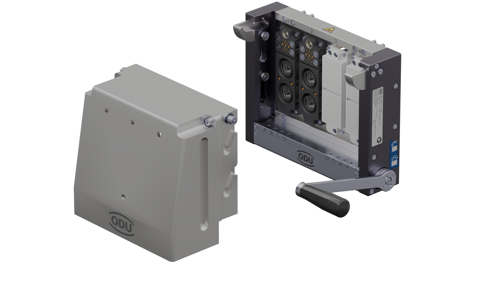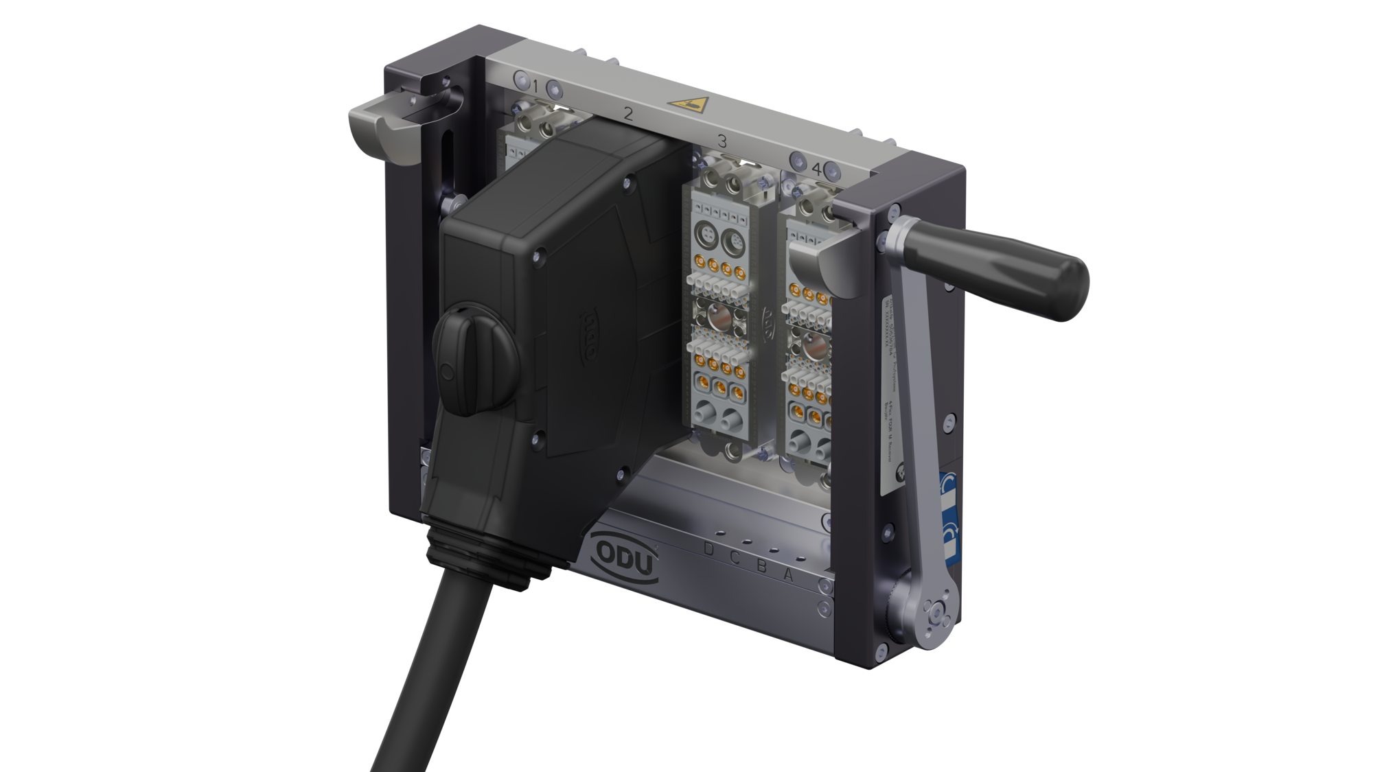 Det kompakte ODU-MAC Black-Line Compact test-interface vist med en ODU Rapid-konnektor.En tredje mulighed er at anvende fire ODU-MAC® Rapid-stik med overførselsmoduler. Rapid-seriens er designet med et praktisk halvskals-princip, der letter monteringen. Det velkendte spindellåsesystem giver både taktil og akustisk feedback, når stikket er låst korrekt.