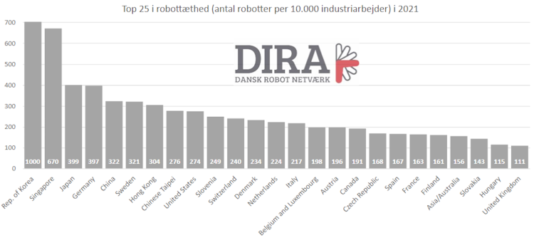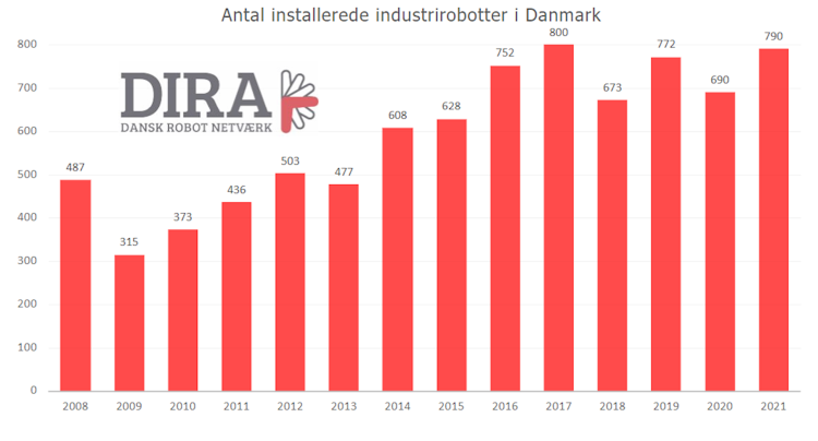 I 2014 lå Danmark på en femte plads i robottæthed i hele verden. Nu – syv år senere – er Danmark på en 12. plads.