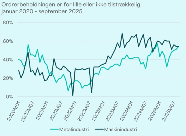Der ryger for få ordre ind i ordrebøgerne hos metal- og maskinindustrien. Hele 54 procent i metal- og maskinindustrien mener, at ordrebeholdningen er for lille eller ikke tilstrækkelig. Det viser nye tal fra Danmarks Statistik. Og især for metalindustrien er det en negativ udvikling siden foråret, hvor det kun var 32 procent, der i april måned vurderede, at ordrebeholdningen var for lille.