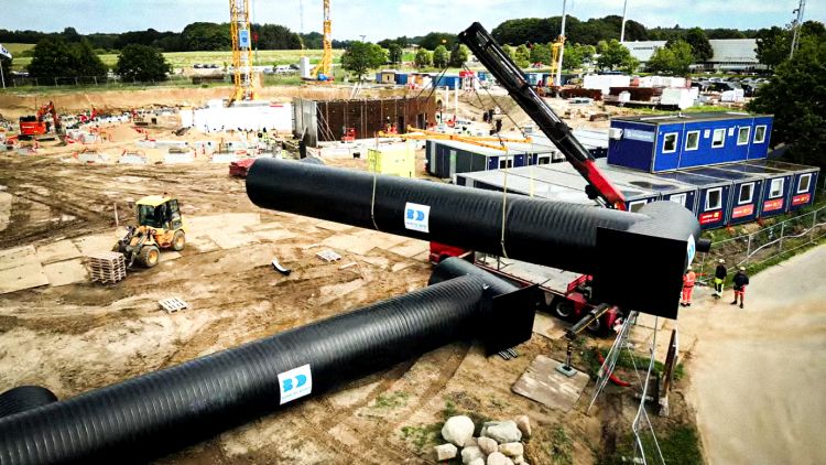 Under jorden i Bjerringbro installeres to kæmpe spiralrør fra Brødrene Dahl. De specialdesignede rør skal opsamle og opmagasinere regnvand til Grundfos’ nye hovedsæde, hvor genanvendelse af regnvand er tænkt ind fra første streg.
