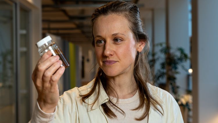 Anne Holm forklarer, at jernoxiderne i okkerslammet kan erstatte kunstigt fremstillede kemikalier, der i øjeblikket bliver brugt til at fjerne de giftige svovlgasser, der dannes under produktionen i biogasanlægget.
